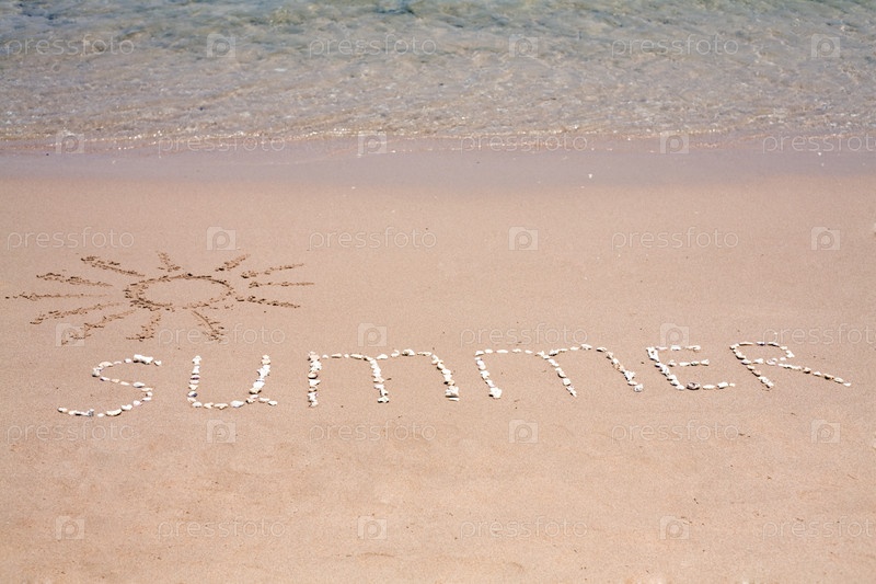 Солнце и слово ЛЕТО, выложенное из камней на морском пляже