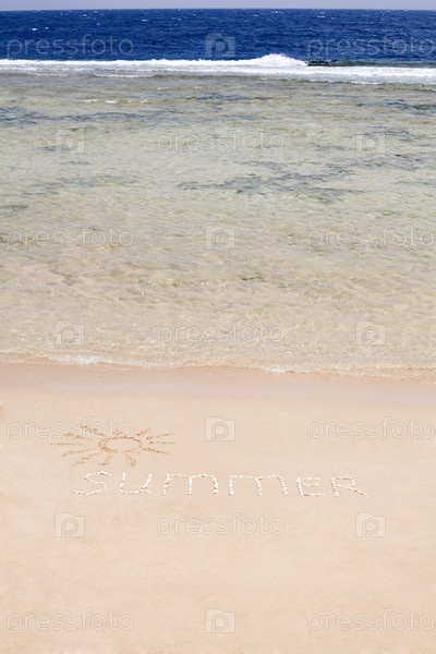 Солнце и слово ЛЕТО, выложенное из камней на морском пляже