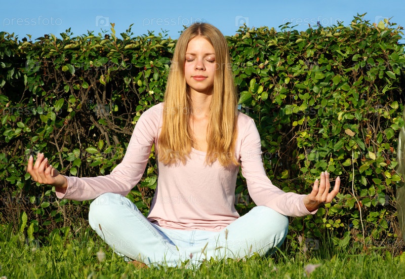 Девушка медитирует в летнем парке