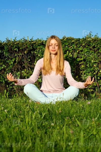 Девушка медитирует в летнем парке