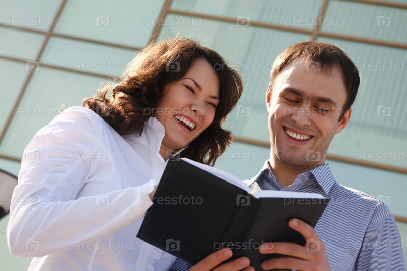 Счастливые деловые люди с записной книжкой на открытом воздухе