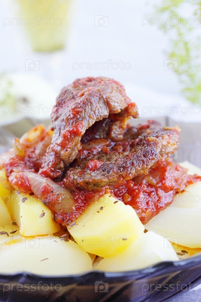 Жареные мясо с соусом и картофелем