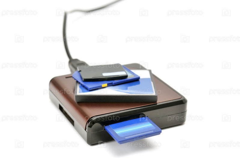 Кард ридер и карты памяти, изолированные на белом фоне