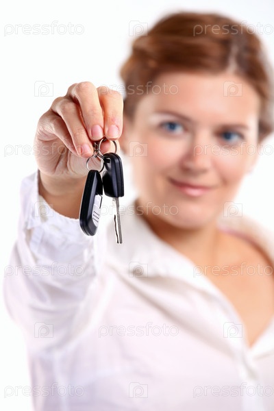 Молодая женщина с ключами от машины в руке на белом фоне