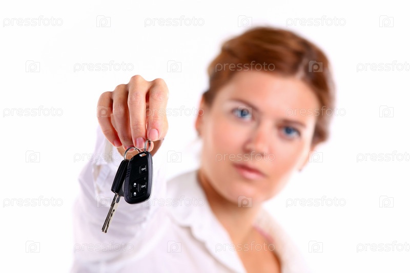 Молодая женщина с ключами от машины в руке на белом фоне