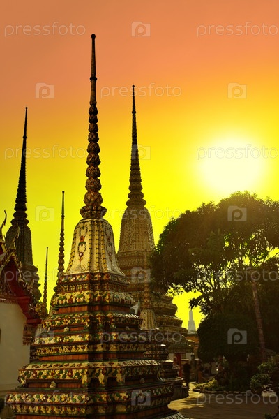 Ступы в храме Ват Пхо на закате, Бангкок, Таиланд