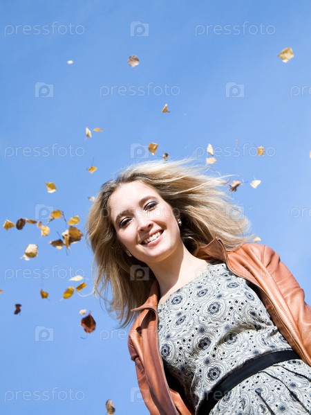 Улыбающаяся девушка на фоне осенних листьев
