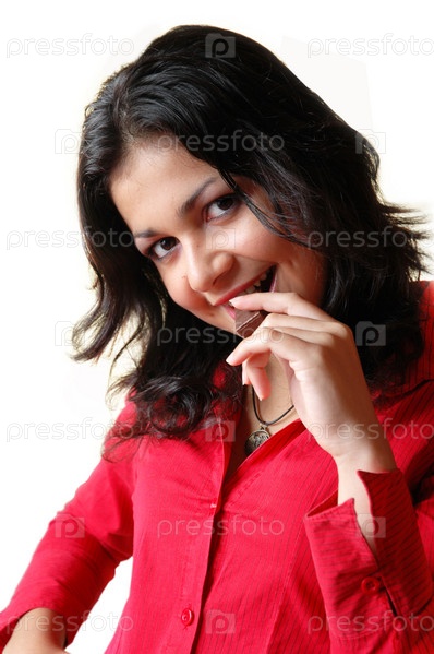 Красивая брюнетка ест шоколад