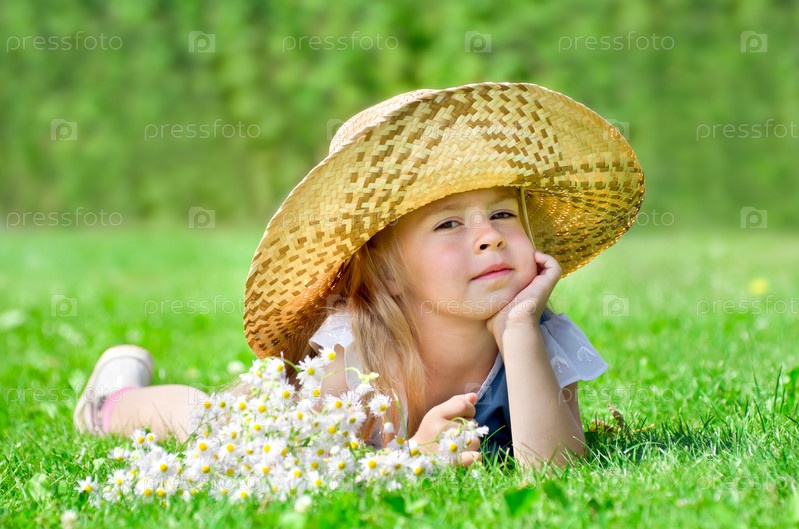 Маленькая девочка в шляпе лежит а зеленой траве