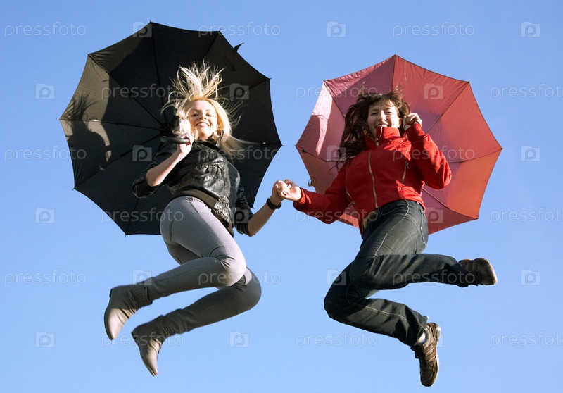 Две молодые женщины держат зонтики и прыгают вместе