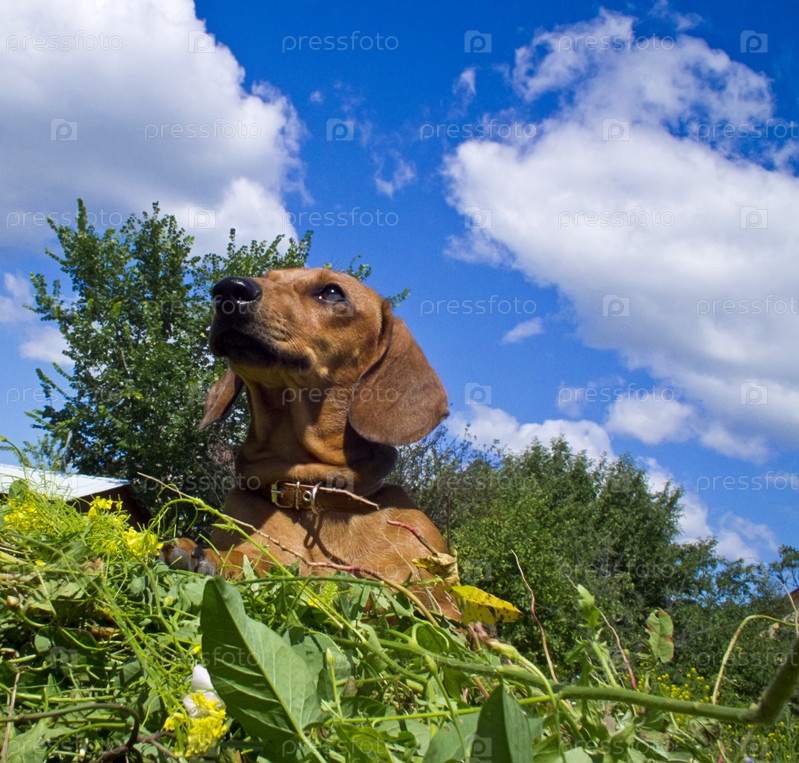 Такса лежит на траве