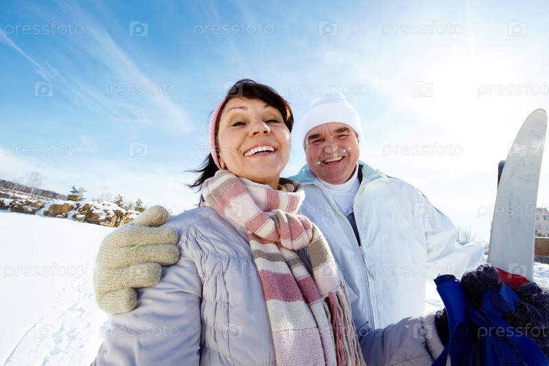 Счастливая пара на отдыхе на лыжах