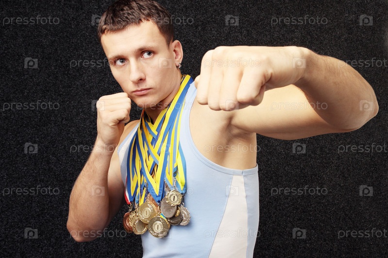 Спортсмен с медалями на его шеи