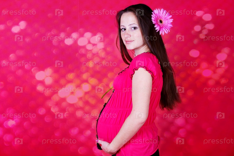 Молодая беременная женщина с герберой в волосах