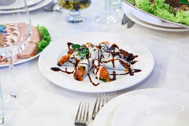 Рулетики с красной икрой на праздничном столе