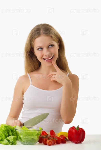 Молодая женщина думает о приготовлении салата