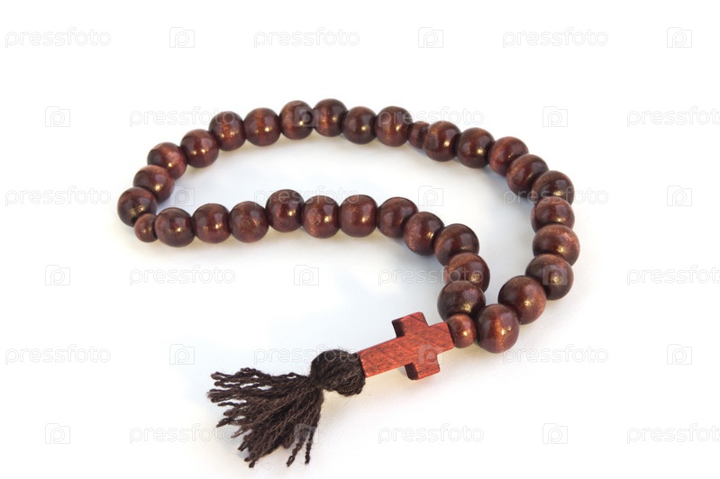 Деревянные четки на белом фоне