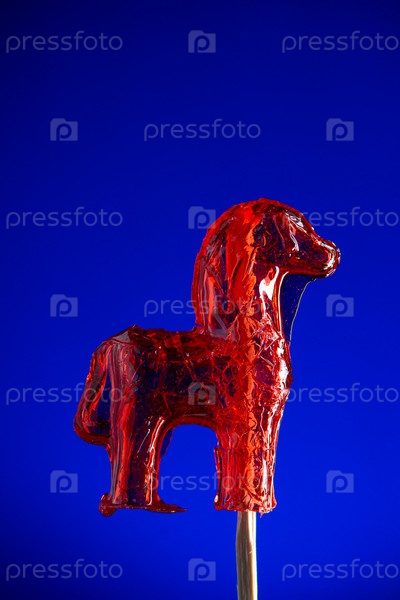 Красный леденец в форме лошади на синем фоне