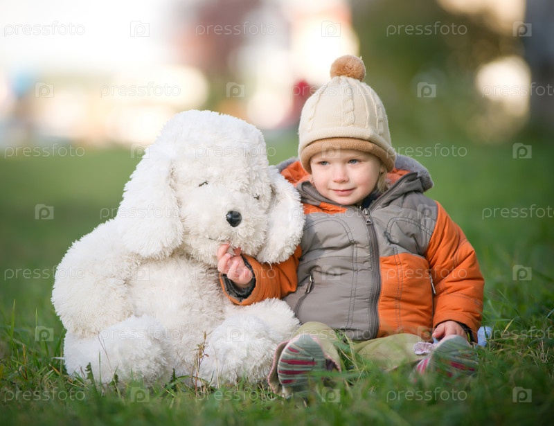 Малыш с плюшевой игрушкой сидит на траве в парке