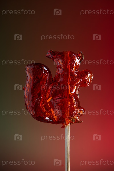Красный леденец в форме белочки на красно-зеленом фоне