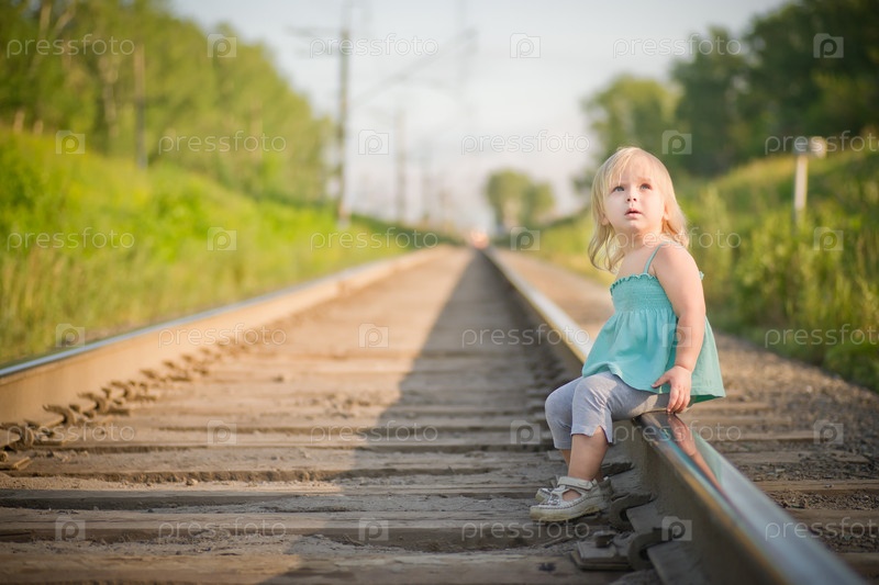 Маленькая девочка сидит на рельсах