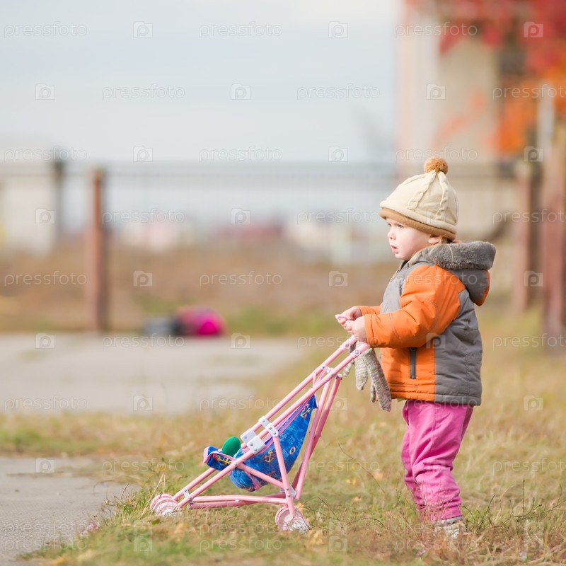 Маленькая девочка с игрушечной коляской на улице осенью
