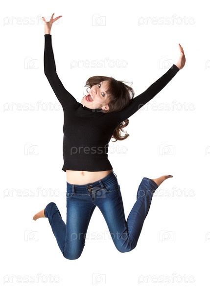 Радостная девушка в прыжке на белом фоне