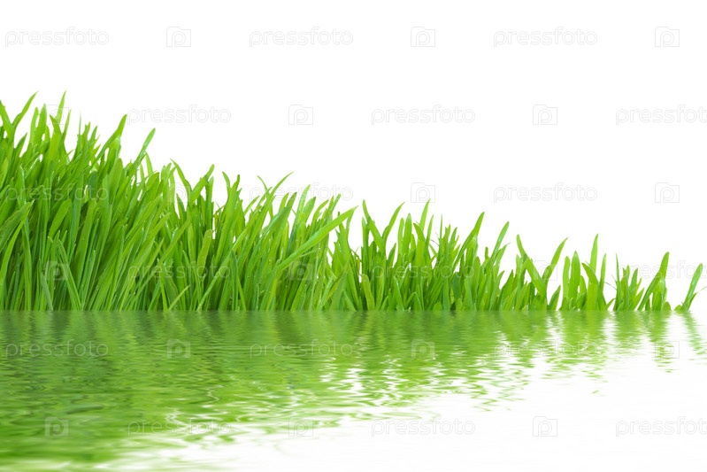 Зеленая трава и ее отражение в воде, изолированные на белом фоне
