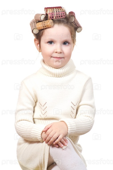 Маленькая девочка с бигуди на голове, изолирована на белом