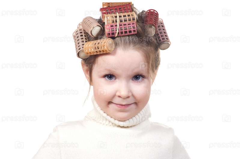 Маленькая девочка с бигуди на голове, изолирована на белом