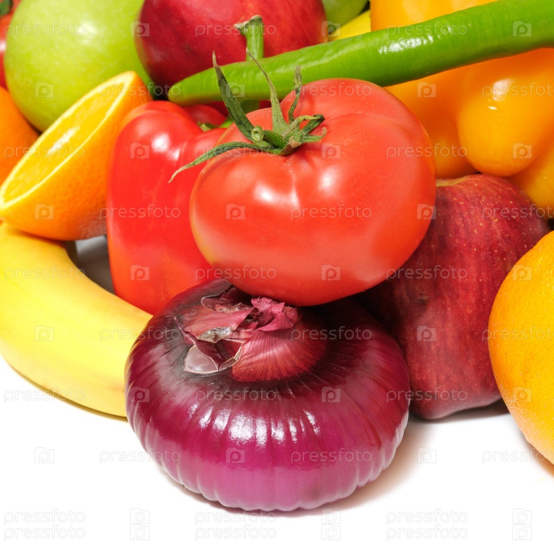 Фрукты и овощи на белом фоне