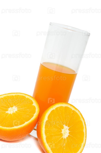 Стакан с соком и апельсины на белом фоне