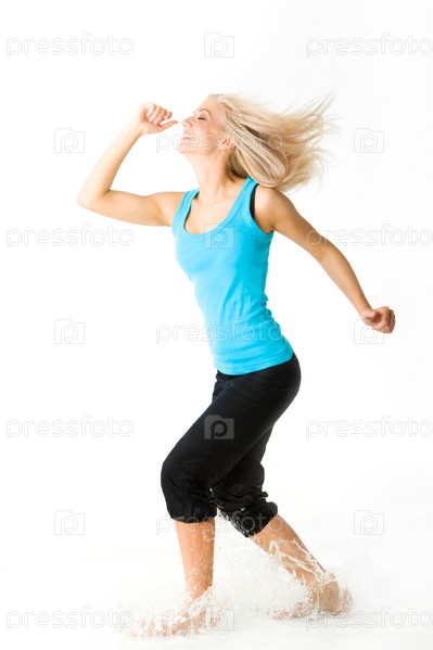 Портрет блондинки, смеющейся во время разливания воды на белом фоне