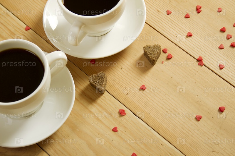 Крупный план - две чашки кофе на деревянном полу,вокруг них разбросано много маленький красный сердец