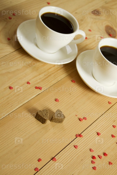 Крупный план - две чашки кофе на деревянном полу,вокруг них разбросано много маленький красный сердец