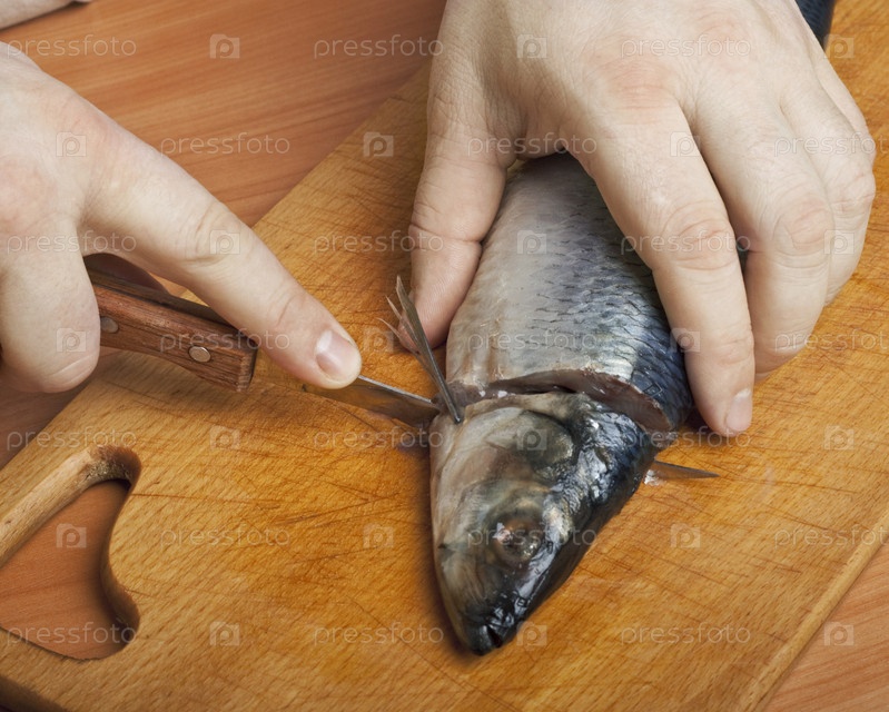 Очистка сельди на кухонной доске