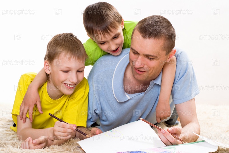 Отец с сыновьями рисуют, лежа на ковре