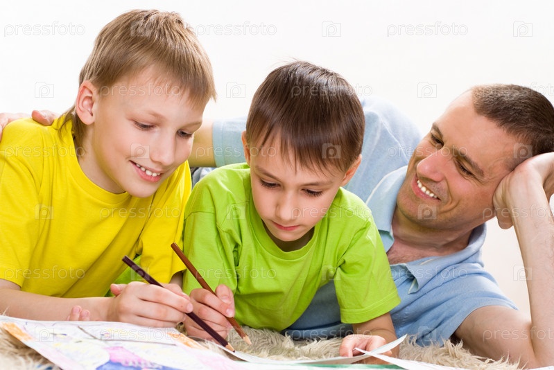 Отец с сыновьями рисуют, лежа на ковре