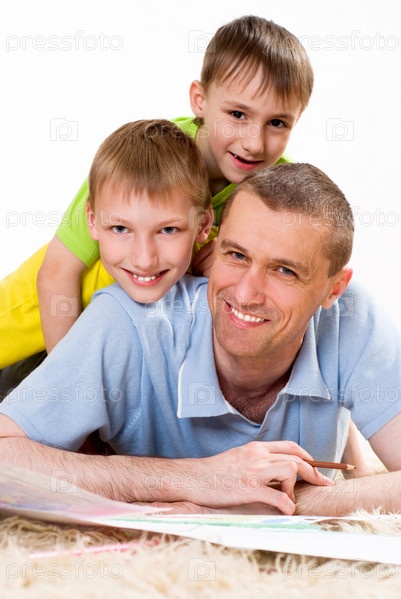 Отец с сыновьями рисуют, лежа на ковре