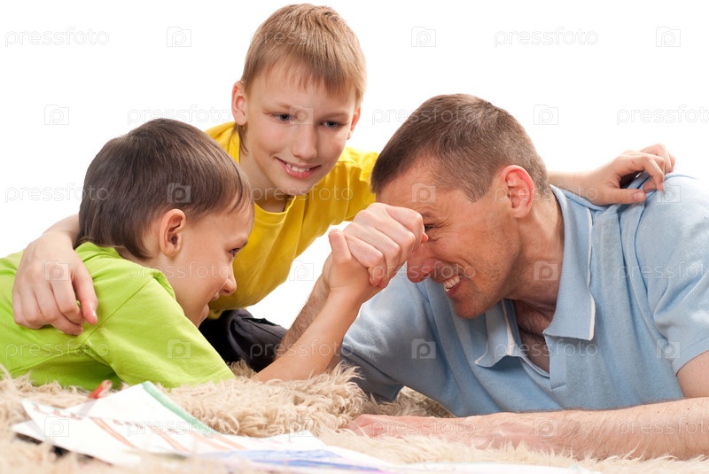 Отец с сыновьями играют на ковре