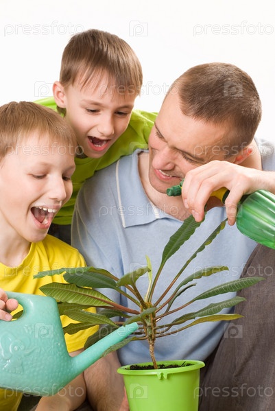 Отец с сыновьями поливают цветок