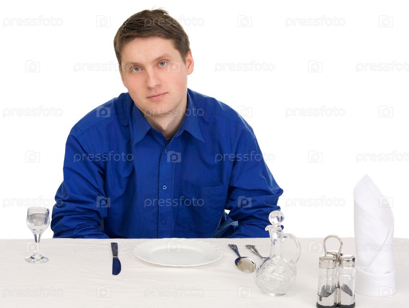 Гость ресторана в синей рубашке на белом фоне