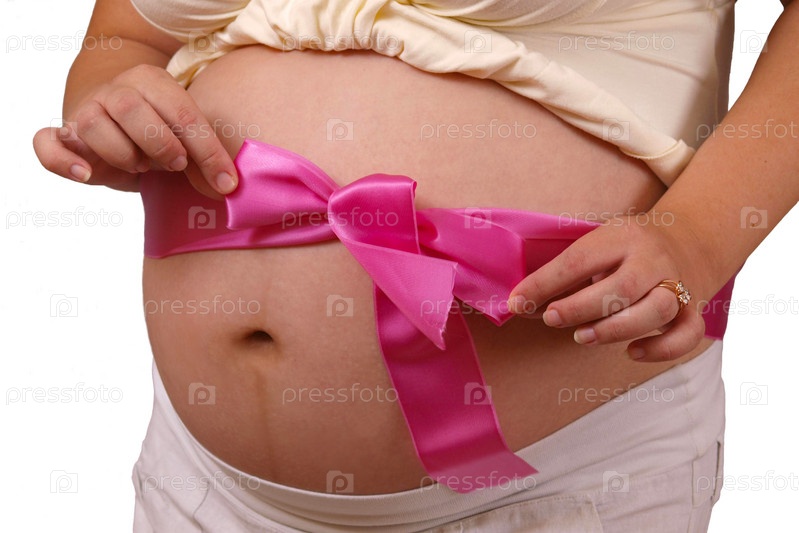 Живот беременной женщины с розовым бантом