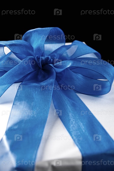 Серебристая подарочная коробка с синим бантом, черный фон