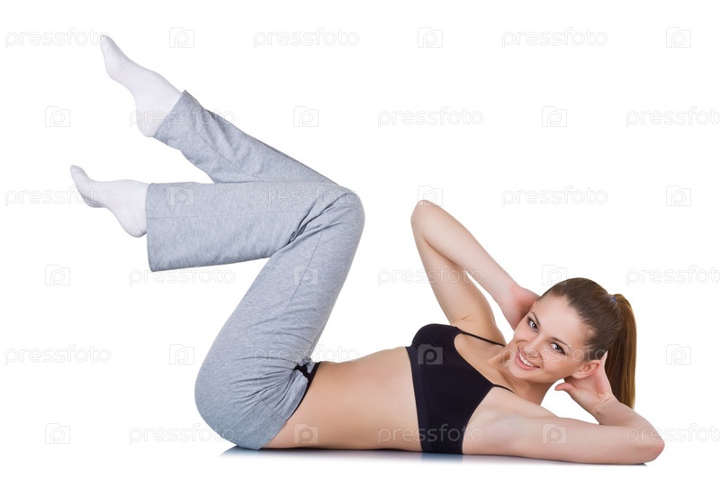 Молодая женщина занимается фитнесом, изолирована на белом фоне