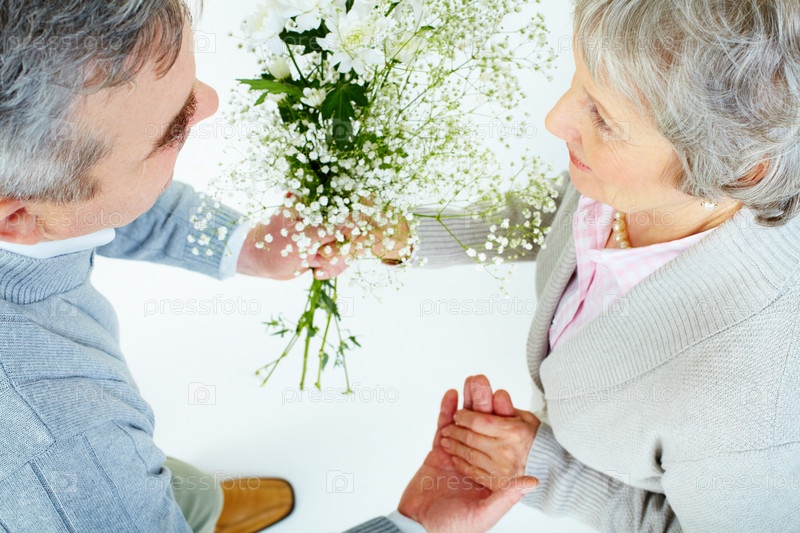 Пожилая пара держит букет цветов
