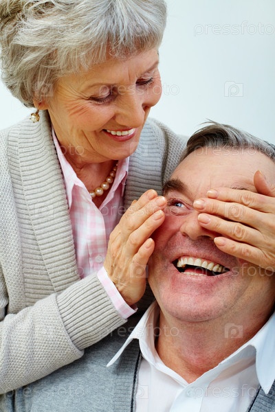 Пожилая женщина закрывает глаза руками своему мужу