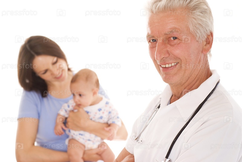 Доктор и женщина с новорожденным ребенком на белом фоне
