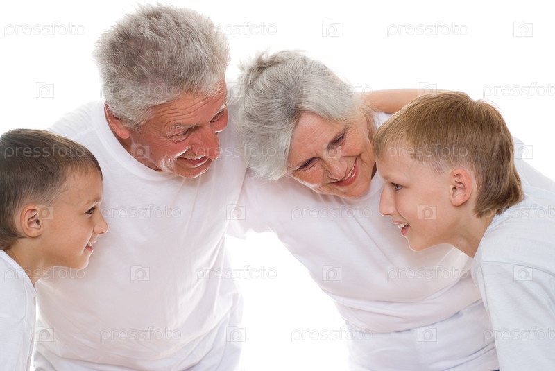 Бабушка, дедушка и внуки на белом фоне