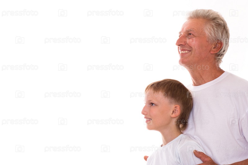 Дедушка с внуком на белом фоне